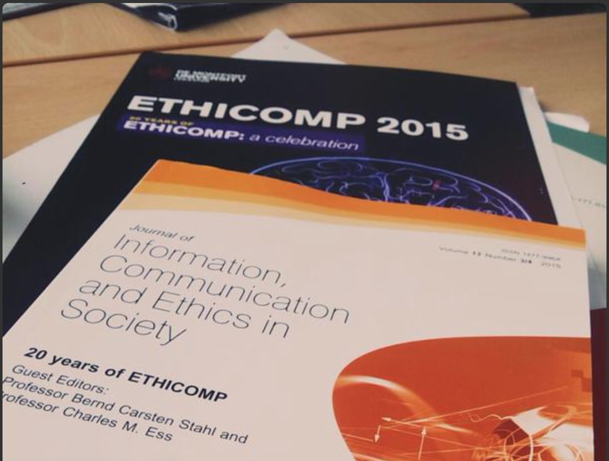 This week I’ve been down in Leicester for Ethicomp 2015, the 20th Anniversary of the conference started back in 1995 by Simon Rogerson and Terry Bynum. It was a very friendly community with some great talks. The keynotes were very interesting, with presentations from Lynne Markus on “Computer Ethics in the Organisation: Pitfalls and Prospects for Corporate Data Responsibility”; Robin Wilton on “Trust, Ethics and Autonomy” and Sarah Spiekermann on “Ethical IT Innovation – A Value Based Systems Design Approach”. The breadth of topics over the three days was wide, looking at many philosophical and practical questions around design of emerging technologies, responsible research and innovation, robot ethics, big data, brain computer interfaces, augmented reality and even a paper on the ethics of human-chicken relationships in video games. The proceedings are available from the Centre for Computing and Social Responsibility at De Montfort (who hosted and organised the event this year) but also will be on the ACM Digital Library at some point too. It was very nice to catch up with researchers Professor Andrew Adams, Professor Kyoshi Murata and Prof Ana Maria Lara Palma from the Centre of Business Information Ethics at Meiji University in Tokyo where I spent a few months as a visiting researcher last summer. They ran a track at the conference presenting international work done on attitudes of young people towards privacy, and in particular on the impact of Snowden’s Revelations. The breadth of countries involved in this project made for some very interesting cross cultural comparisons (they had carried out the questionnaire and interviews in Japan, Taiwan, China, Sweden, New Zealand, Spain, Germany and Mexico). There is also a nice special edition of the Journal of Information, Communication and Ethics in Society dedicated to the 20th Anniversary of the Conference.